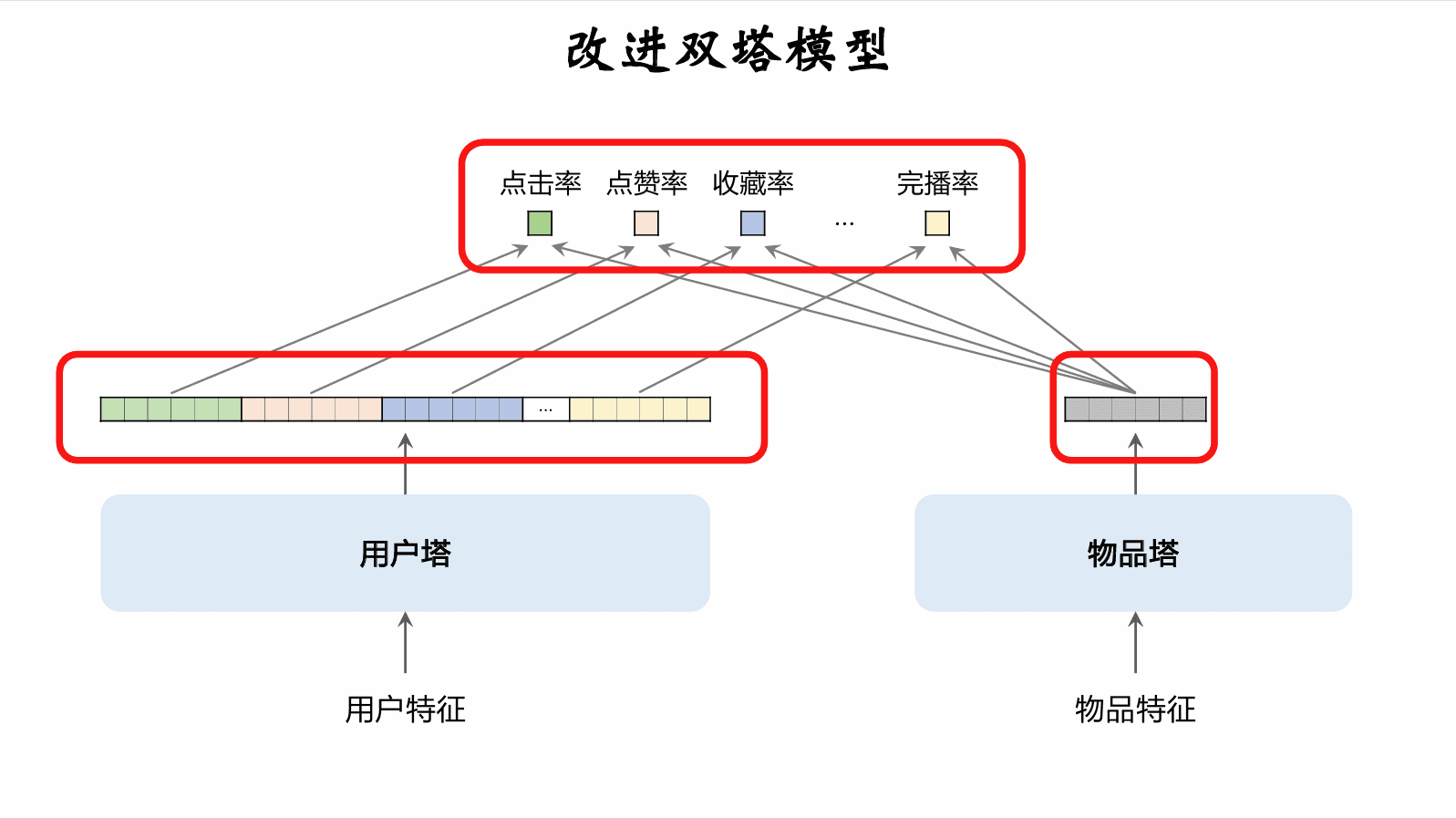 - 改进:使用多向量模型代替单向量模型。(标准的双塔模型也叫单向量模型。)